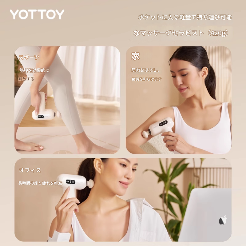 わずか420グラムの超軽量設計で持ち運びに便利な電動筋膜ローラーです。 12キログラムの強力な推進力と9ミリメートルの振幅で、深部の筋膜まで効果的にアプローチします。 六種類の専用マッサージヘッドが付属しており、部位に応じて使い分けが可能です。 デジタル液晶画面で操作も簡単、自宅やオフィスでの疲労回復に最適な筋膜ローラーです。