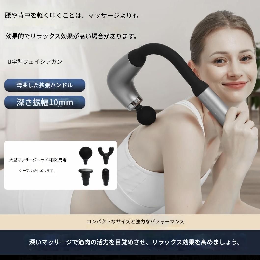 背中や腰など手の届きにくい部位も簡単にケアできる電動筋膜ローラーです。 曲線設計のU字型ハンドルで腰背敲打が不要となり、一人でも快適に深層筋膜へアプローチできます。 10ミリメートルの振幅で筋肉群を効果的にほぐし、4種類の専用マッサージヘッド付きで様々な部位に対応可能です。 充電式で持ち運びも便利な筋膜ローラーで、毎日のリラクゼーションタイムをより充実させます。