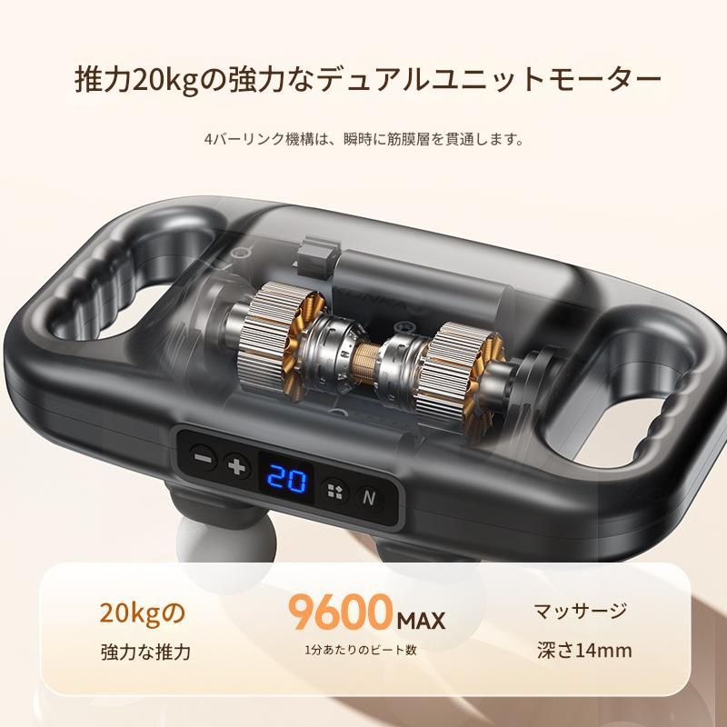 推力20kgの強力なモーターが搭載されており、プロ仕様の深い筋膜リリースを実現