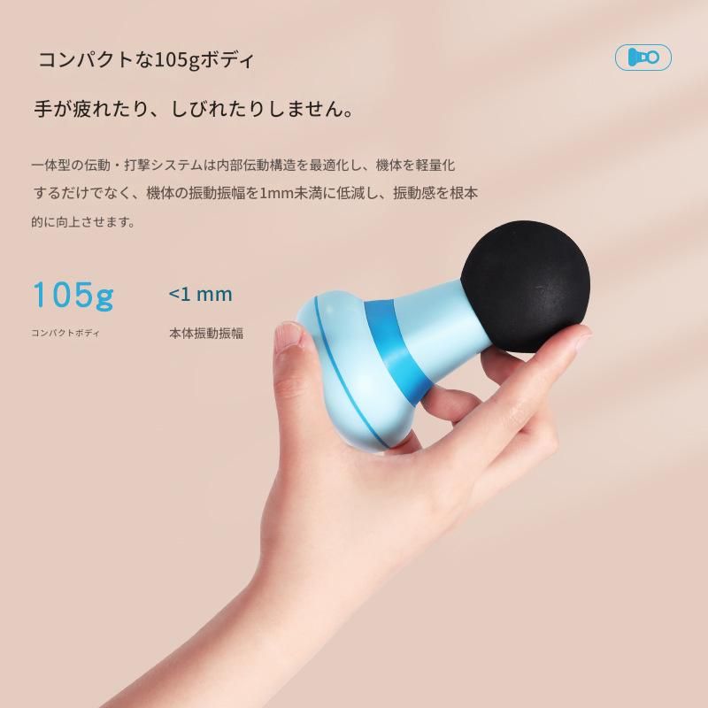 わずか105グラムの超軽量設計で持ち運びに便利な電動筋膜ローラーです。 手のひらサイズのコンパクトな本体は長時間の使用でも疲れにくく、全身のケアが可能です。 一体型の電動システムを採用し、振動幅1ミリ以下の精密な振動で深部の筋膜まで効果的にアプローチします。 オフィスや旅行先でも手軽に使える携帯性に優れたマッサージ器具です。