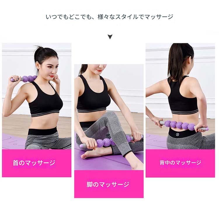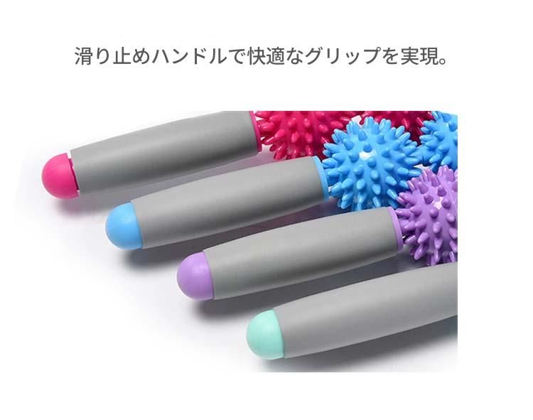 突起のついた複数の玉が特徴的な筋膜ローラーのスティックタイプです。 腰や背中、太もも、ふくらはぎなど全身の気になる部位に使用でき、深部までしっかりと圧をかけることができます。 グリップ部分が持ちやすく、力加減を自由に調整できるため、自分好みの強さでマッサージが可能です。 運動後のケアや日々の疲労回復に最適なアイテムです。