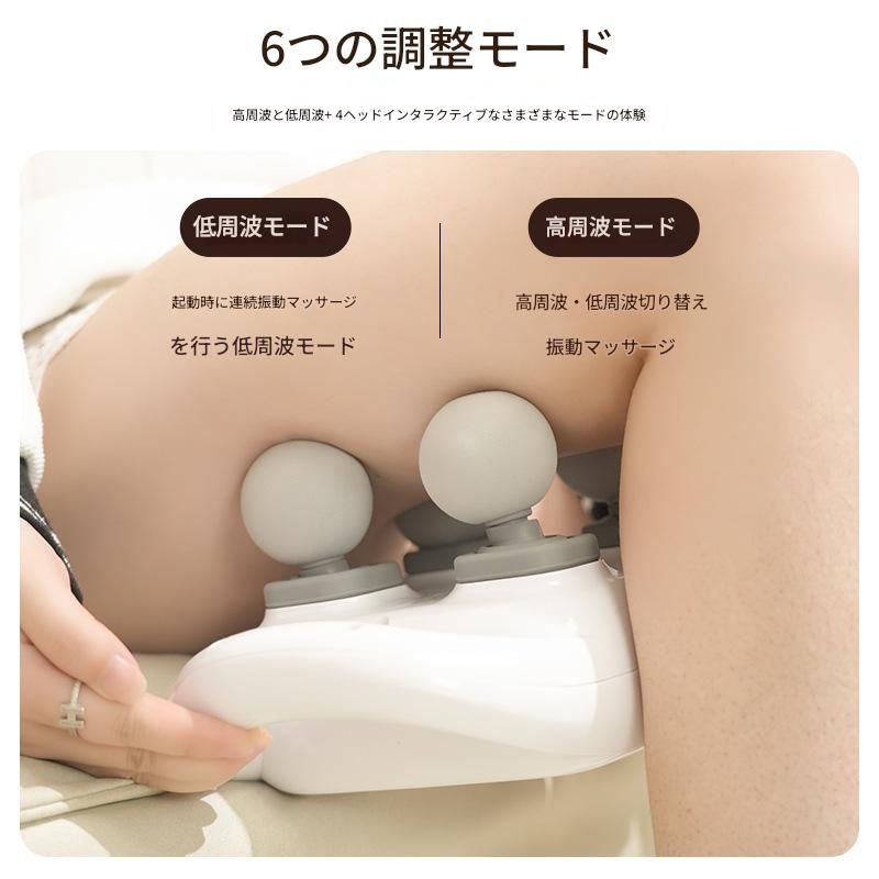 四つの球状ヘッドを搭載した電動筋膜ローラーで全身の筋膜リリースを実現します。 2000ミリアンペア時のバッテリーを内蔵し長時間の使用が可能です。 六種類の振動モードを搭載しており低周波から高周波まで切り替えることで筋肉の深部まで効果的にアプローチします。 デジタル表示画面で振動レベルを確認しながら自分に合った強度で筋膜ケアができます。